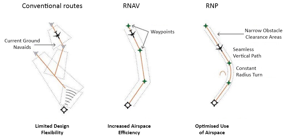 PBN moves aircraft navigation away from this methodology to a system primarily reliant on satellite-based technologies, utilising Global Navigation Satellite Systems (GNSS) such as the USA’s Global Positioning System (GPS). This enables aircraft to fly routes directly between virtual waypoints at set geographical coordinates, rather than between physical beacons. As the number of possible virtual waypoints is effectively infinite, routes using them can be much more direct than those using GBNA.