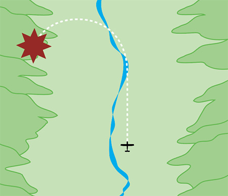 Positioning in the middle of the valley means a steeper turn is necessary and there may be insufficient room to turn back safely. Source: Mountain flying.